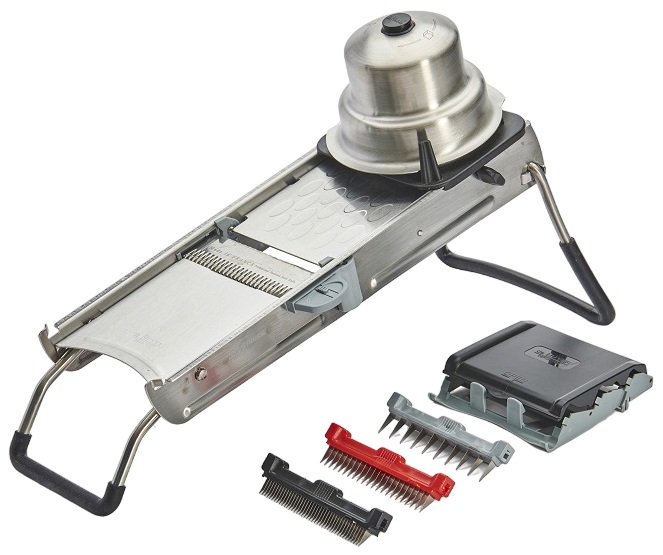 В комплекте горизонтальное сплошное и рифлёное лезвие и 3 лезвия "жульен" 2/4/10 мм.