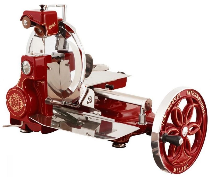 Слайсер Berkel Flywheel (Volano) B114 красный используется на предприятиях общественного питания, торговли и пищевых производствах для нарезки мяса, рыбы, хлеба, овощей, сыра, колбасных изделий и других продуктов. Модель оснащена встроенным заточным устройством для ножа, регулировкой толщины нарезки и прорезиненные ножки. Материал корпуса - алюминий, материал ножа - хромированная сталь.