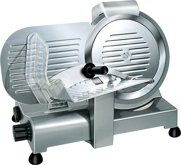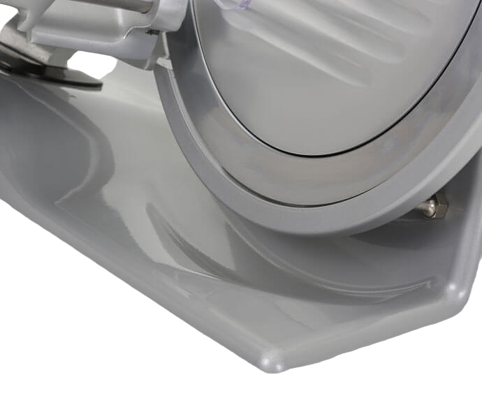 Профессиональный мотор с функцией принудительной вентиляции исключает возможность перегрева оборудования, а также делает его работу практически бесшумной. Слайсер оснащен фиксированным устройством для заточки ножа с двойным наждаком. Поддон для продуктов и перемычка для регулирования толщины среза выполнены из алюминия, отполированного путем анодирования, что обеспечивает их гигиеническую чистоту и защиту от коррозии.