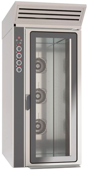 Устройство оснащено 3 реверсными вентиляторами с регулируемой скоростью. Дверца печи, полностью выполненной из нержавеющей стали AISI 430, снабжена раскрывающимся стеклопакетом, что при необходимости позволяет легко осуществлять чистку оборудования изнутри. Галогенная подсветка рабочей камеры делает процесс использования устройства еще более удобным.