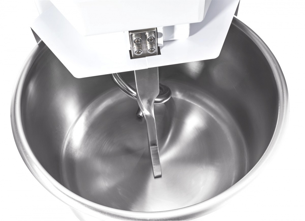 Корпус выполнен из высококачественной конструкционной стали с полимерным покрытием, металлические детали машины, контактирующие с продуктом во время замеса (спираль, дежа, нож) - из нержавеющей стали AISI 304.