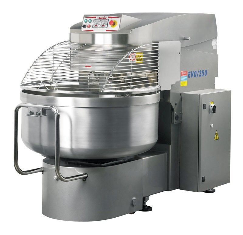 Спиральный тестомес Sottoriva EVO 200 используется на предприятиях пищевой промышленности и общественного питания, в пекарнях и кондитерских для замеса различных видов теста. Модель оснащена гидравлическим подъемным механизмом траверсы, подкатной дежой, мощным двигателем с ременным приводом, обеспечивающим вращение спирали, отдельным двигателем для вращения дежи, контрольной панелью управления и защитной крышкой над дежой. Корпус выполнен из окрашенной стали, дежа и спираль - из нержавеющей стали.