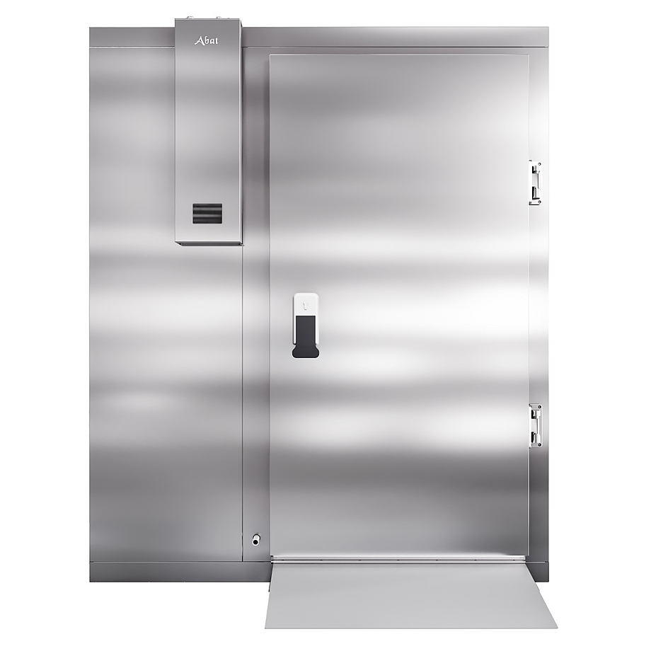 Камера шоковой заморозки Abat ШОКК-201 используется на предприятиях общественного питания, торговли и пищевых производствах для быстрой заморозки и хранения продуктов. Модель оснащена воздухоохладителем, 2 вентиляторами, навесной дверью, низкотемпературным уплотнителем, оттайкой горячим газом, подогревом и двухсторонним замком. Материал пандуса и пола камеры - рифленая нержавеющая сталь, материал стенок и потолка - сэндвич-панель из нержавеющей стали (толщина 80 мм).