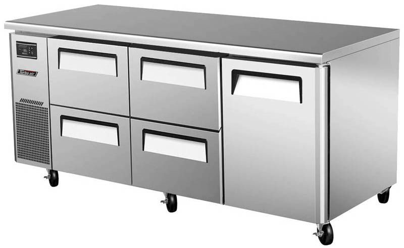 Холодильный стол Turbo air KUR18-2D-4 предназначен для раскатки теста, обработки, охлаждения и кратковременного хранения продуктов и напитков на предприятиях общественного питания и торговли. Корпус выполнен из нержавеющей стали (гальванизированная сталь на оборотной стороне и внизу) с применением пожаробезопасных стенок толщиной 60 мм, уплотнения - из АБС-пластика (акрилонитрилбутадиенстирола), не пропускающего конденсата, пол - из нержавеющей стали с алюминиевыми вставками по бокам и сзади оборудования, тройные направляющие - из высококачественной нержавеющей стали.