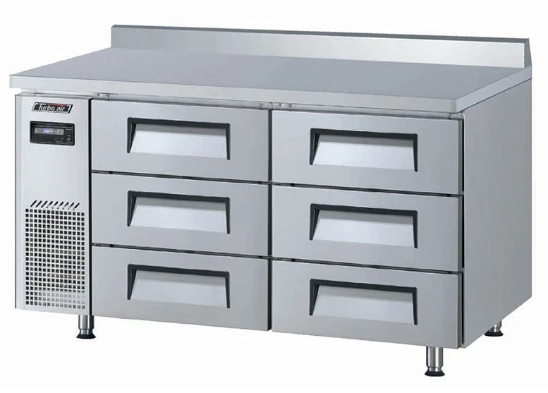 Холодильный стол Turbo air KWR15-3D-6-600 используется для охлаждения, заморозки и длительного хранения пищевых продуктов, а также для обработки ингредиентов на предприятиях общественного питания, торговли и пищевых производствах. Динамическая система охлаждения. Стол установлен на 4 колесах, оснащен дверью и 3 ящиками. Материал корпуса, ножек и направляющих - нержавеющая сталь, материал задней и нижней панелей - гальванизированная сталь, материал пола - нержавеющая сталь с алюминиевыми вставками, материал полок - толстая стальная проволока с виниловым покрытием, материал уплотнения - ABS-пластик.