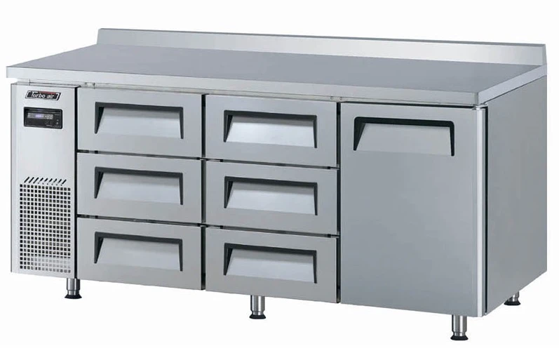Холодильный стол Turbo air KWR18-2D-6-750 используется для охлаждения, заморозки и длительного хранения пищевых продуктов, а также для обработки ингредиентов на предприятиях общественного питания, торговли и пищевых производствах. Динамическая система охлаждения. Стол установлен на 6 колесах, оснащен дверью, полкой и 6 ящиками. Материал корпуса и направляющих - нержавеющая сталь, материал задней и нижней панелей - гальванизированная сталь, материал пола - нержавеющая сталь с алюминиевыми вставками, материал полок - толстая стальная проволока с виниловым покрытием, материал уплотнения - ABS-пластик.