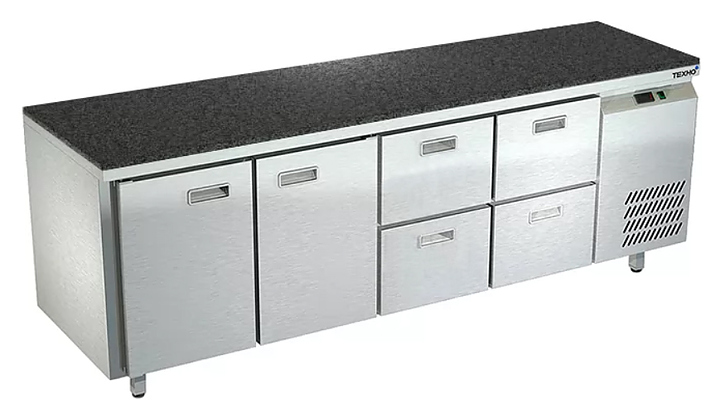 Холодильный стол Техно-ТТ СПБ/О-322/24-2206 предназначается для раскатки теста, обработки, охлаждения и кратковременного хранения продуктов и напитков на предприятиях общественного питания, торговли и пищевых производствах. Секции оснащены направляющими и ящиками с доводчиками. Материал корпуса - нержавеющая сталь AISI 430, материал столешницы - гранит (толщина 20 мм), материал задней панели и дна - оцинкованная сталь.