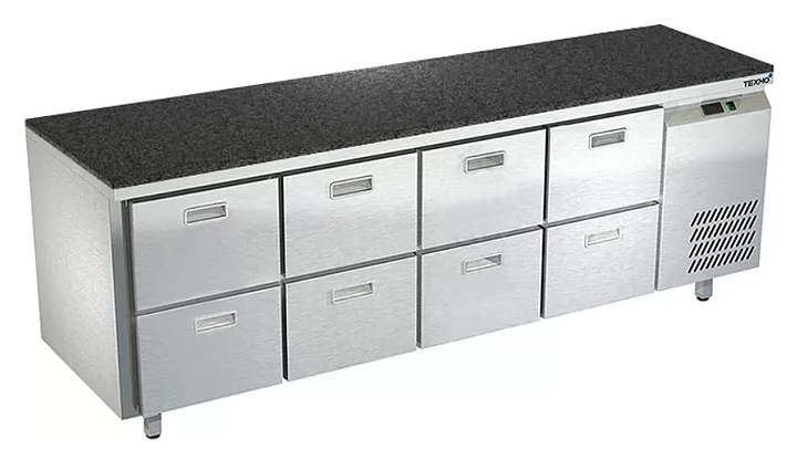 Холодильный стол Техно-ТТ СПБ/О-323/08-2206 предназначается для раскатки теста, обработки, охлаждения и кратковременного хранения продуктов и напитков на предприятиях общественного питания, торговли и пищевых производствах. Секции оснащены направляющими и ящиками с доводчиками. Материал корпуса - нержавеющая сталь AISI 430, материал столешницы - гранит (толщина 20 мм), материал задней панели и дна - оцинкованная сталь.