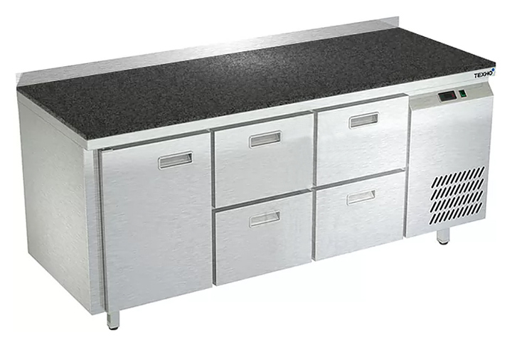 Холодильный стол Техно-ТТ СПБ/О-422/14-1806 предназначается для раскатки теста, обработки, охлаждения и кратковременного хранения продуктов и напитков на предприятиях общественного питания, торговли и пищевых производствах. Секции оснащены направляющими и ящиками с доводчиками. Материал корпуса - нержавеющая сталь AISI 430, материал столешницы - гранит (толщина 20 мм), материал задней панели и дна - оцинкованная сталь.