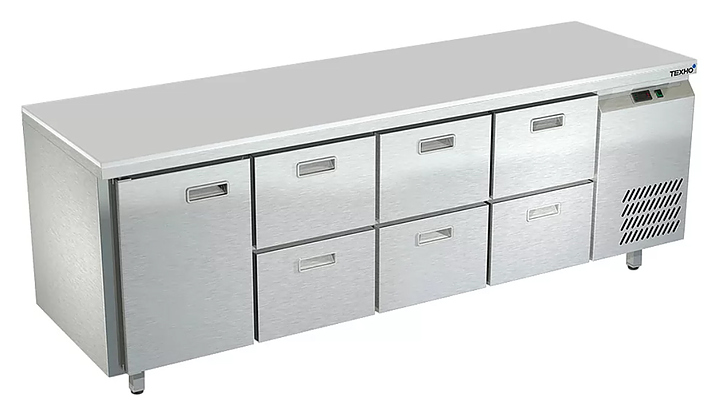 Холодильный стол Техно-ТТ СПБ/О-522/16-2206 предназначается для раскатки теста, обработки, охлаждения и кратковременного хранения продуктов и напитков на предприятиях общественного питания, торговли и пищевых производствах. Секции оснащены направляющими и ящиками с доводчиками. Материал корпуса - нержавеющая сталь AISI 430, материал столешницы - полипропилен (толщина 20 мм), материал задней панели и дна - оцинкованная сталь.