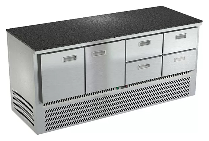 Холодильный стол Техно-ТТ СПН/О-322/24-1907 предназначается для раскатки теста, обработки, охлаждения и кратковременного хранения продуктов и напитков на предприятиях общественного питания, торговли и пищевых производствах. Секции оснащены направляющими и ящиками с доводчиками. Материал корпуса - нержавеющая сталь AISI 430, материал столешницы - гранит (толщина 20 мм), материал задней панели и дна - оцинкованная сталь.