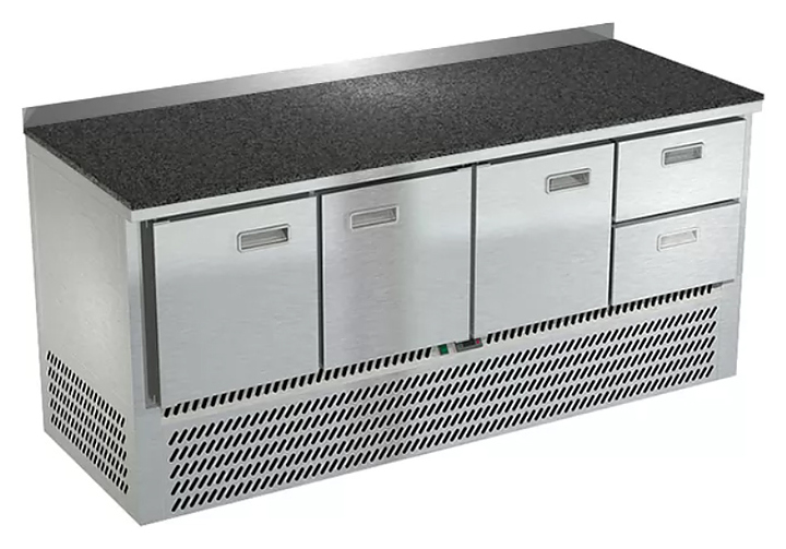 Холодильный стол Техно-ТТ СПН/О-422/32-1906 предназначается для раскатки теста, обработки, охлаждения и кратковременного хранения продуктов и напитков на предприятиях общественного питания, торговли и пищевых производствах. Секции оснащены направляющими и ящиками с доводчиками. Материал корпуса - нержавеющая сталь AISI 430, материал столешницы - гранит (толщина 20 мм), материал задней панели и дна - оцинкованная сталь.