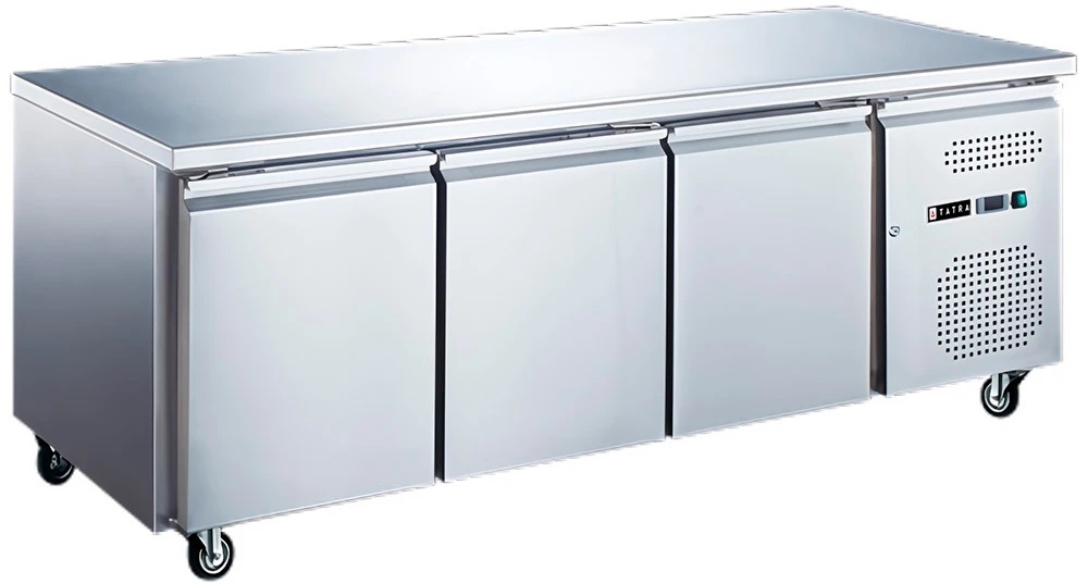 Холодильный стол Tatra TRTGN3 TN используется на предприятиях общественного питания, торговли и пищевых производствах для охлаждения и кратковременного хранения различных блюд, напитков и продуктов, а также для раскатки теста и обработки ингредиентов. Модель оснащена 3 секциями с самозакрывающимися глухими дверьми с магнитным уплотнителем и цифровым термостатом. Материал корпуса и столешницы - нержавеющая сталь, теплоизоляция выполнена из полиуретана.