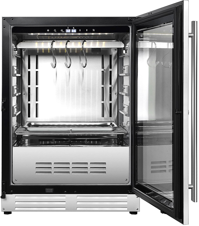 Шкаф для мяса MeatAge VI60 WT предназначается для охлаждения и вызревания мяса, ветчины и салями на предприятиях общественного питания и торговли, пищевых производствах, отелях, офисах, а также в домашнем использовании. Шкаф оснащен белой LED подсветкой внутреннего объема, тачпадом с подсветкой, акустической сигнализацией и запираемой дверью. Материал корпуса и комплектующих - нержавеющая сталь AISI 304, материал двери - ударопрочное закаленное стекло.