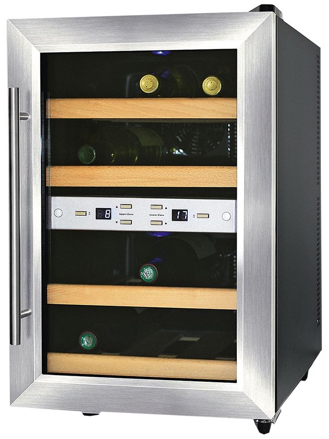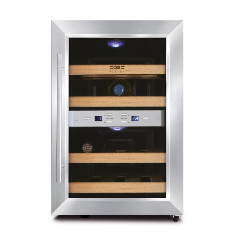 Винный шкаф CASO WineDuett 12 предназначен для охлаждения и длительного хранения бутилированного и разливного вина в частных домах, квартирах, отелях и офисах. Модель оснащена 2 зонами хранения с независимой установкой температуры в каждой из них, панелью управления с 2 LED-дисплеями и 4 выдвижными деревянными полками. Дверная рама и ручка выполнены из нержавеющей стали, дверца - из стекла с ультрафиолетовым фильтром.