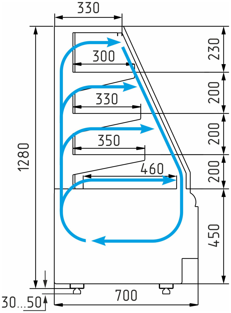 - Должна быть установлена не ближе 2 м от отопительных приборов, запрещается эксплуатация витрины при попадании на нее прямых солнечных лучей, воздушных потоков от кондиционеров, вентиляторов и обогревателей