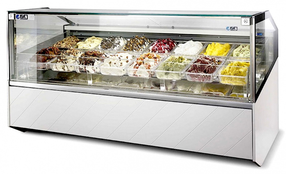 Витрина для мороженого ISA Gelato Supershow 155 RV H135 используется на предприятиях общественного питания и торговли для демонстрации и хранения мороженого, сорбета и йогурт-мороженого. Каркас изготовлен из углеродистой стали, окрашенной порошковой краской, дно зоны выкладки - из полированной нержавеющей стали, задняя панель - из пластифицированной стали, контейнеры - из прозрачного полиуретана. Цельный корпус имеет изоляцию из пенополиуретана, вспененного углекислотой, без использования озоноразрушающих веществ.