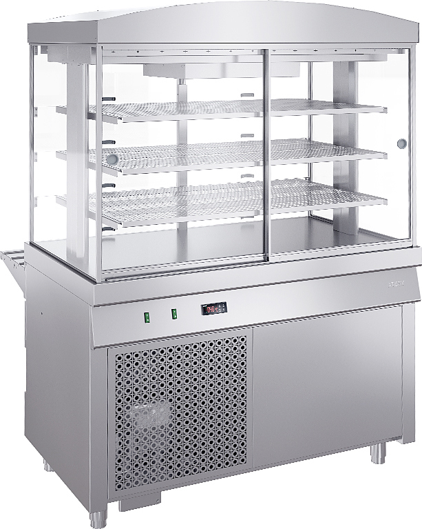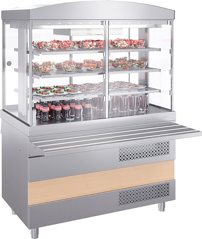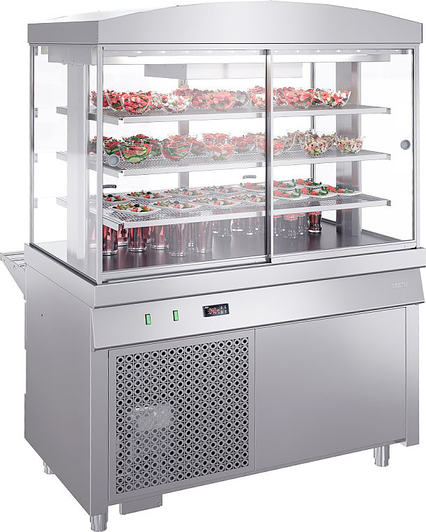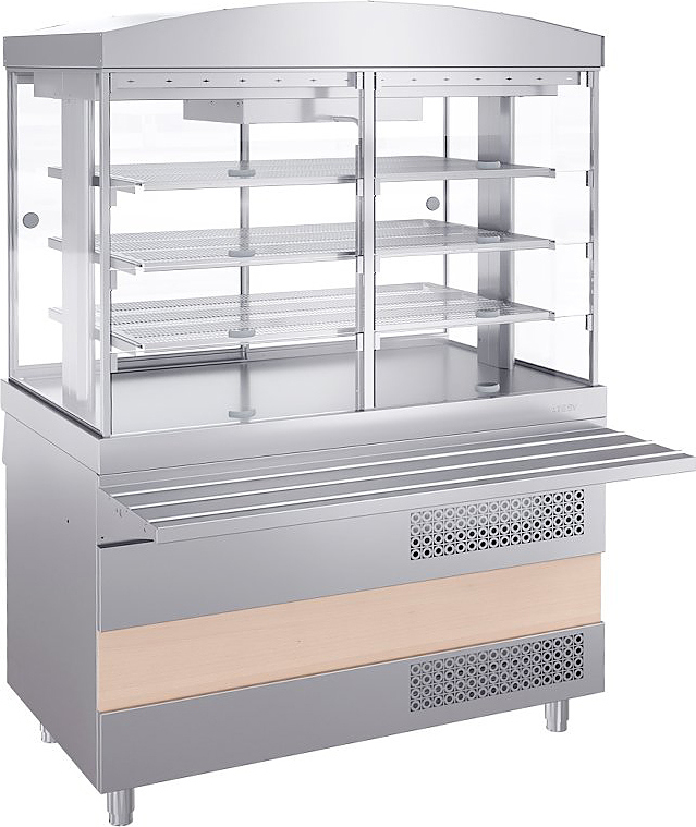 Холодильная витрина ATESY Ривьера ХВ-1200-02 используется на предприятиях общественного питания и торговли для кратковременного хранения, демонстрации и раздачи холодных напитков, салатов, кисломолочных продуктов и других блюд, требующих хранения в охлажденном состоянии. Модель оснащена 3 вместительными съемными перфорированными полками. Столешница выполнена из нержавеющей стали AISI 430 и усилена листом ламинированной ДСП толщиной 16 мм, боковые стенки витрины и двери со стороны обслуживающего персонала - из стеклопакетов, дверцы со стороны покупателя - из оргстекла, полки и ;направляющая для подносов - из нержавеющей стали, ножки - из нержавеющей стали с пластиковой опорной частью.