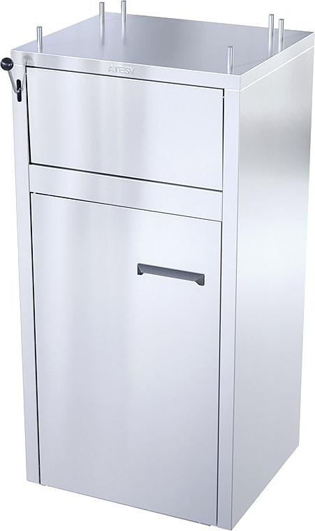 Станция сбора отходов ATESY ССО-120-Р-01 используется на предприятиях общественного питания, торговли для утилизации пищевых остатков, одноразовой посуды и различной картонной упаковки. В модели предусмотрена полка для подносов и внутренний мусороприемник на колесах. Тумба и емкость - шлифованная легированная стал.