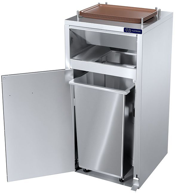 Станция KAYMAN СО-124-П А используется на предприятиях общественного питания, торговли и пищевых производствах для сбора, сортировки и временного хранения пищевых отходов, одноразовой посуды и упаковочной бумаги от продуктов. Модель оснащена полкой для хранения подносов и выкатной мусорной емкостью. Материал тумбы и емкости - высококачественная нержавеющая сталь.