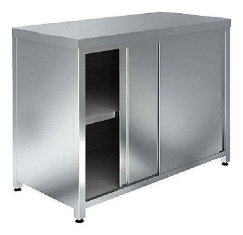 Стол-тумба Кобор  СТ-150/70 произведена из высококачественной нержавеющей стали, что позволяет использовать предмет в различных цехах. Комплектация стола включает в себя двери-купе. Во избежание прогибов столешница усилена листом ламинированной ДСП толщиной 16 мм. Ножки изделия регулируются по высоте, для исключения проблем с неровным напольным покрытием, предотвращая наклон рабочей поверности.