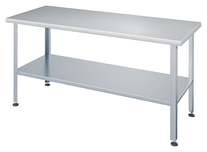 Производственный стол ATESY СР-С-1100.700-02-ПСОц серии Стандарт используется на предприятиях общественного питания, торговли и пищевых производствах для раскатки теста, приготовления различных блюд и хранения кухонных принадлежностей. Материал рабочей поверхности – нержавеющая сталь AISI 430 усилена листом ЛДСП (толщина 16 мм), материал каркаса и сплошной полки – оцинкованная сталь, конструкция - разборная.