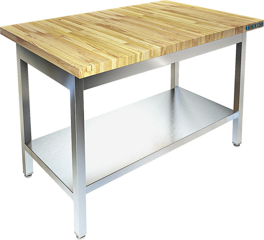 Кондитерский стол Техно-ТТ СП-323/1608 предназначен для раскатки теста и обработки ингредиентов для приготовления кондитерских и хлебобулочных изделий, а также для расстановки и хранения посуды и кухонного инвентаря на предприятиях общественного питания, торговли и пищевых производствах. Модель оснащена регулируемыми по высоте ножками, что позволяет компенсировать неровности пола. Материал разборного каркаса - труба (40x40 мм) из нержавеющей стали AISI 304, материал сплошной полки - нержавеющая сталь AISI 430, материал столешницы - бук.