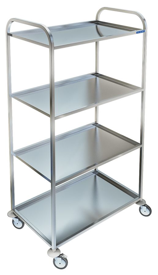 Сервировочная тележка Техно-ТТ ТП-240 предназначена для доставки готовых блюд, сбора тарелок, чашек и стаканов со столов на предприятиях общественного питания и торговли. Модель оснащена 4 полками и 4 колесами, 2 из которых с тормозными устройствами. Разборный каркас выполнен из квадратной трубы 20х20 мм из нержавеющей стали AISI 304, полки - из нержавеющей стали AISI 304.