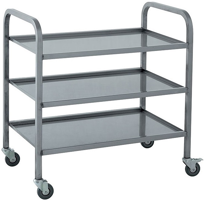 Сервировочная тележка Enigma Е-ТС-086/3 используется на предприятиях общественного питания, торговли и пищевых производствах для транспортировки инвентаря, посуды, продуктов, пищевых отходов и предметов сервировки. Модель оснащена 3 полками, бортиками, 2 ручками и колесами. Материал изделия - высококачественная нержавеющая сталь AISI 430.