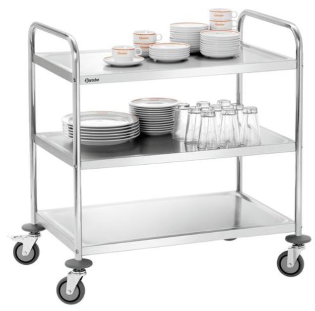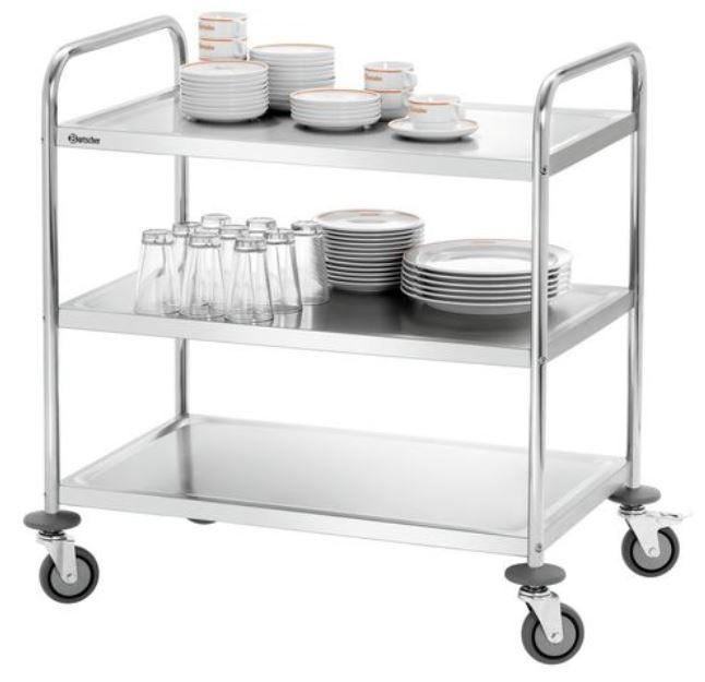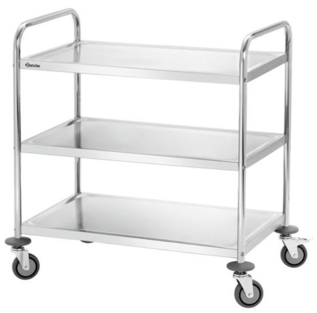 Тележка Bartscher TS301 используется на предприятиях общественного питания, торговли и пищевых производствах для сбора грязной посуды. Модель оснащена колесами, 2 из них с тормозами. Материал изделия - хромникелевая сталь (труба 25.8 мм).