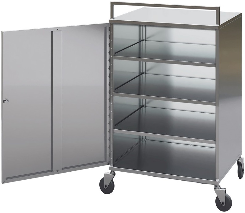 Тележка Марихолодмаш 695175.00 используется для перевозки готовых блюд, мясных полуфабрикатов, а также других продуктов и инвентаря на предприятиях общественного питания, торговли и пищевых производствах. Модель оснащена колесам, 2 из которых с тормозом и и глухой дверью. Материал каркаса, обшивки, полок и двери - высококачественная нержавеющая сталь AISI 430.