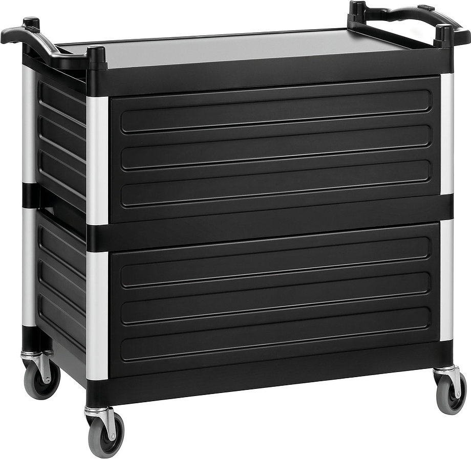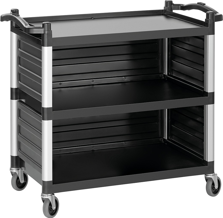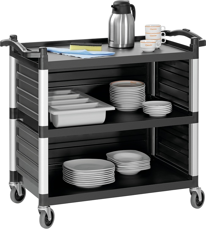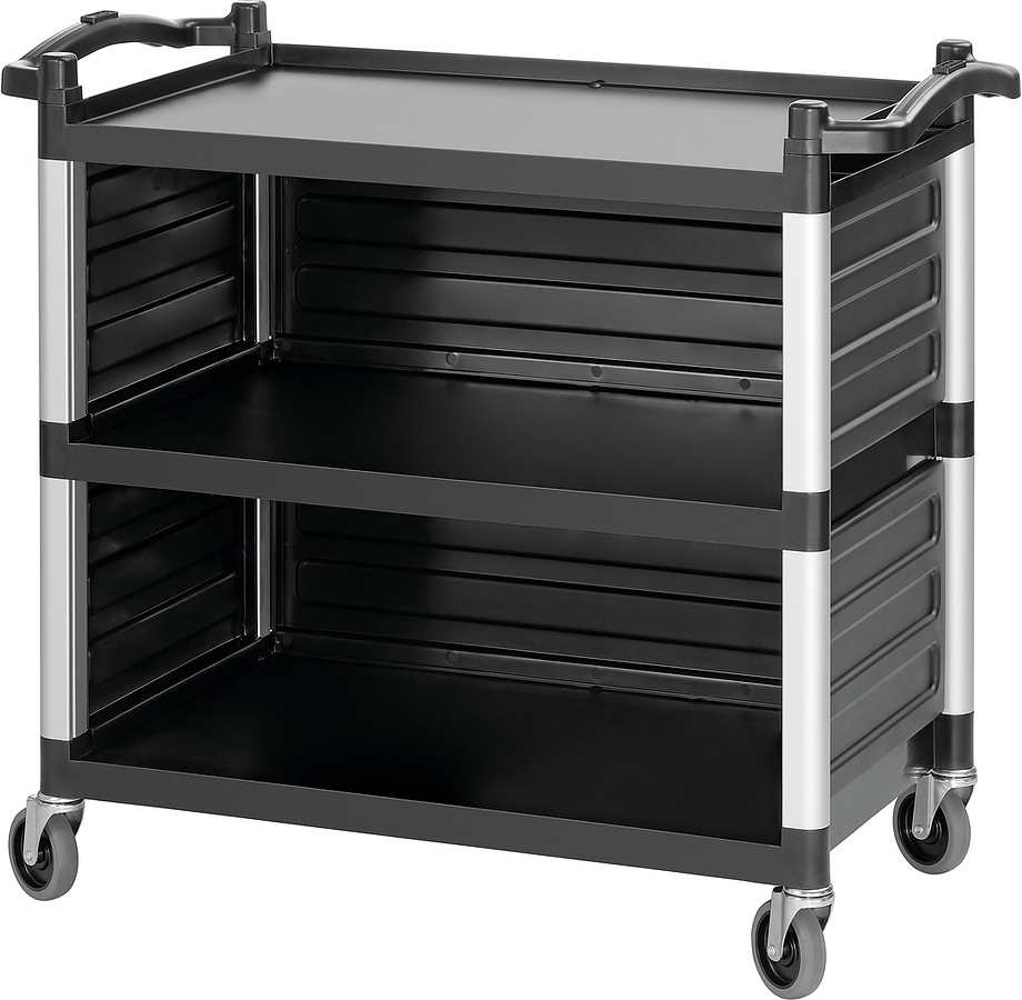Тележка Bartscher TSA300V используется на предприятиях общественного питания, торговли и пищевых производствах для транспортировки готовых блюд и сбора грязной посуды. Модель с 3 полками. Материал каркаса - трубчатый алюминиевый профиль, материал полок и стенок - черный пластик.