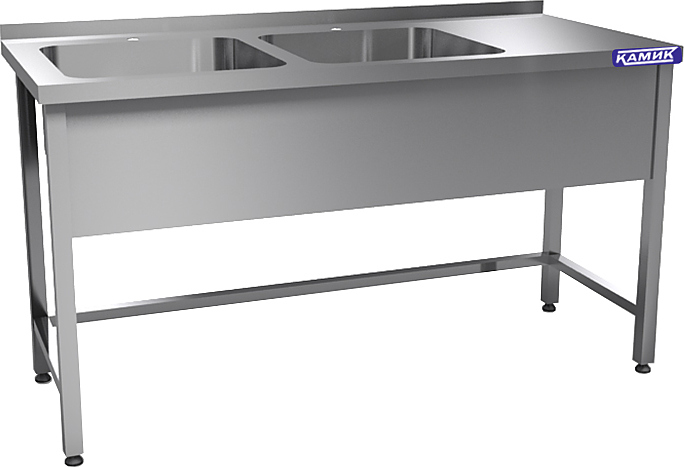 Моечная ванна КАМИК ВМ-2-340774 используется на предприятиях общественного питания и торговли для мойки посуды, овощей и фруктов. Сварной каркас и столешница выполнены из нержавеющей стали AISI 430, цельнотянутая емкость - из нержавеющей стали AISI 304.