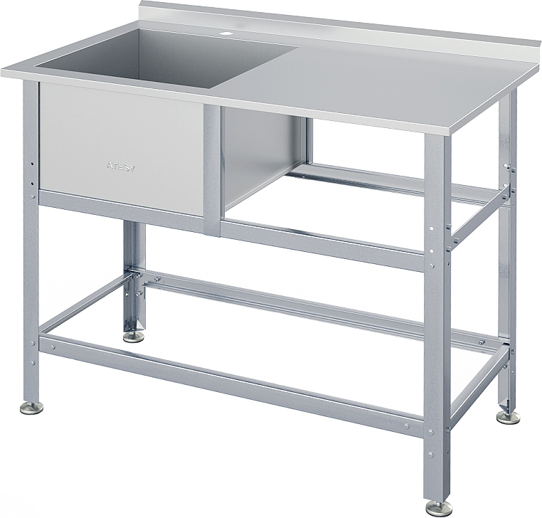 Моечная ванна ATESY ВСМС-Б-1Л.700-1550.850-1-02 серии Бюджет предназначается для мытья посуды и кухонного инвентаря, овощей и фруктов, а также для оттайки замороженных продуктов. Кромки ванны имеют безопасную фальцовку, углы зашлифованы. Ножки регулируются по высоте. Тип конструкции - разборная. Поверхность стола с внутренней стороны укреплена ламинированной ДСП, что увеличивает прочность и исключает прогиб. Материал каркаса - профиль из оцинкованной стали (толщина 1.2 мм), материал ванны - нержавеющая сталь AISI 430 (толщина 0.7 мм), материал опоры регуляторов высоты - нержавеющая сталь, ножки выполнены из пластика.