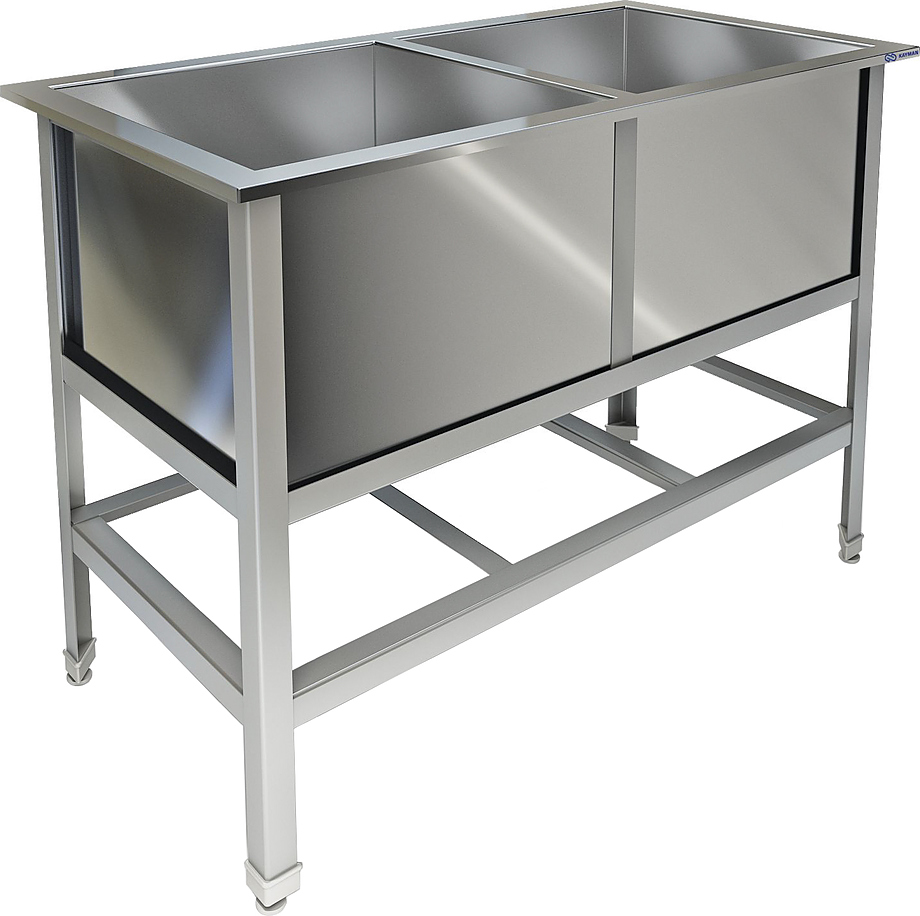 Моечная ванна используется на предприятиях общественного питания и торговли для мытья и ополаскивания продуктов, посуды и различного инвентаря. Модель с закругленными краями оснащена регулируемыми по высоте ножками, что позволяет компенсировать неровности пола. Сварной каркас выполнен из нержавеющей стали AISI 430, сварные мойки - из нержавеющей стали AISI 304 толщиной 0,8 мм, выпуски - из нержавеющей стали.