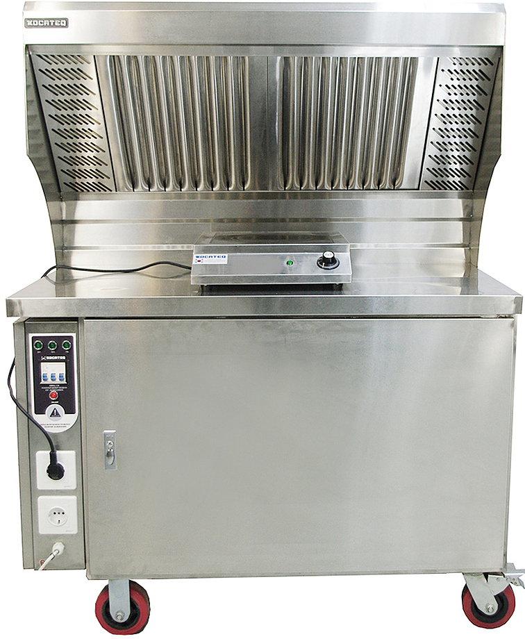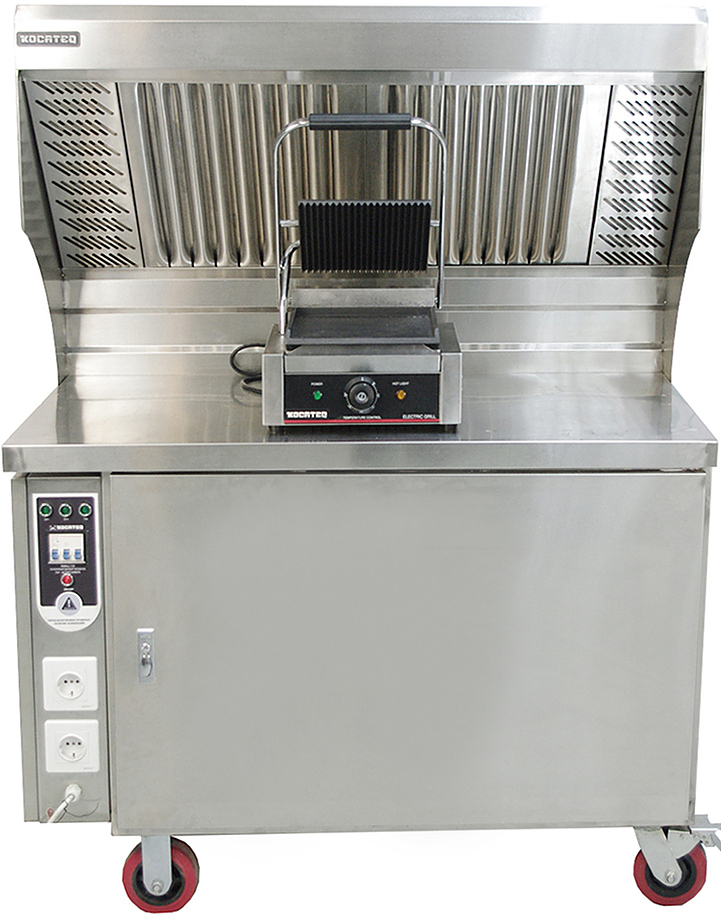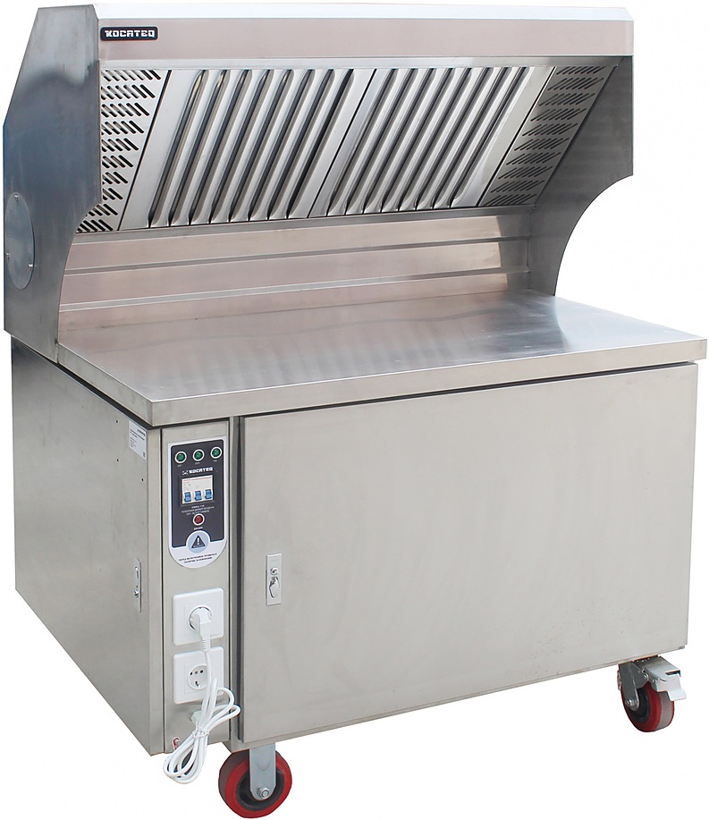 Стенд со встроенной системой очистки воздуха Kocateq VWALL 1100 используется в пекарнях, на предприятиях общественного питания, торговли и пищевых производствах для очистки воздуха от жира, масла, дыма и водяного пара. Вентилятор всасывает воздух из зоны готовки и после многостадийной очистки выбрасывает его под стенд. Модель оборудована колесами и 2 встроенными розетками. Материал корпуса - нержавеющая сталь AISI 201, фильтров - нержавеющая сталь.