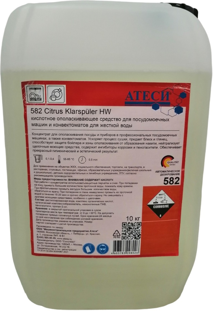 Ополаскиватель ATESY 582 используется на предприятиях общественного питания, торговли и пищевых производствах для для автоматической мойки посуды и пароконвектоматов. Средство состоит из комплекса органических кислот (в т.ч. лимонная кислота), биоразлагаемых органических комплексообразователей, этоксилатов жирных спиртов, связующего агента, ПАВ и ухаживающих компонентов.