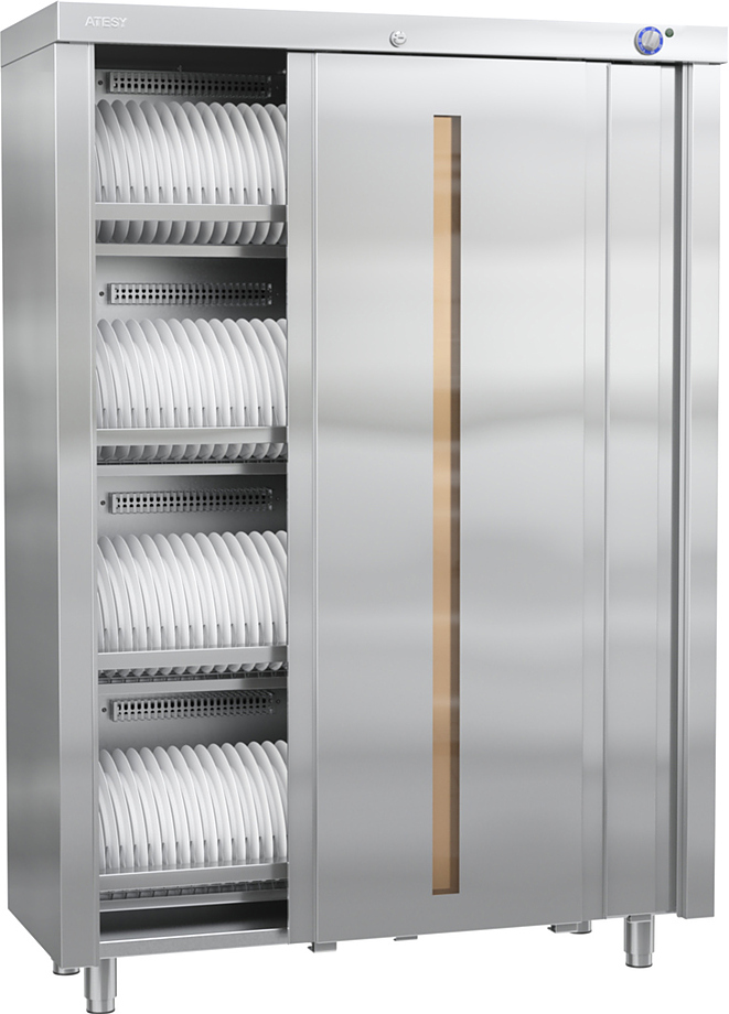 Шкаф для стерилизации посуды ATESY ШЗДП-4-1200-02-1 предназначается для обеззараживания столовой посуды, разделочных досок, крышек и других кухонных принадлежностей на предприятиях общественного питания, торговли и пищевых производствах. Модель оснащена дверцами со смотровыми окнами и таймером процесса стерилизации (до 120 мин). Материал корпуса и всех деталей - антикоррозионная сталь AISI 430 с полированной поверхностью.