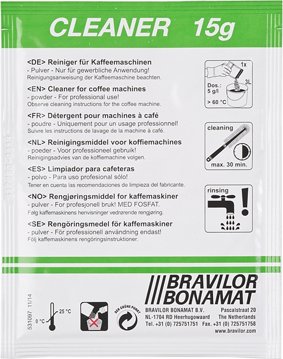 Чистящее средство Bravilor Bonamat Cleaner предназначается для очистки поверхностей кофемашин на предприятиях общественного питания, торговли, офисах и в гостиничном бизнесе.