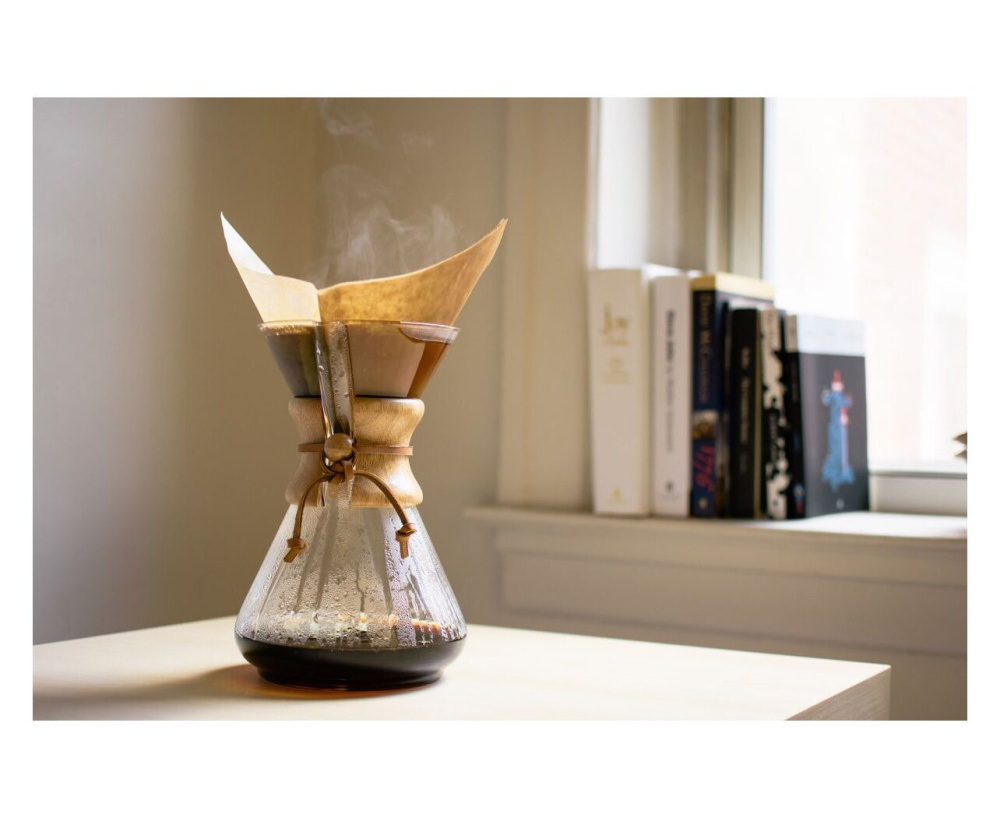 Берем Chemex и кладем в него сложенный конусом фильтр. Обильно проливаем фильтр водой (около 500 мл), затем выливаем воду не вынимая фильтр. Засыпаем молотый кофе. Производим предсмачивание кофе, чтобы вся поверхность кофе стала влажной (1 грамм кофе впитывает около 2 мл воды). Тонкой струей воды в течении 3,5-4,5 минут проливаем остальную воду.