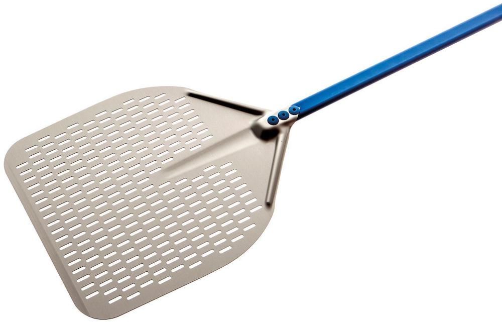 Лопата для пиццы GIMETAL A-37RF серии Azzurra предназначается для загрузки, выгрузки и поворачивания пиццы и других хлебобулочных изделий в процессе приготовления на предприятиях общественного питания, торговли, пищевых производствах и в домашних условиях. Головка прямоугольной формы. Лопатка оснащена длинной рукояткой. Материал головки - высококачественный анодированный алюминий, материал рукоятки и заклепок - анодированный алюминий с покрытием лазурно-голубого цвета, перфорация выполнена методом лазерной проточки.