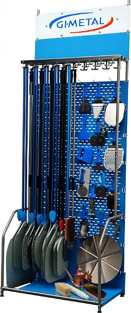 Стенд GiMetal ES1 предназначается для предпродажной демонстрации инвентаря для пиццы. 3 ряда 2-х уровневых крючков для навесных предметов, перфорированная стенка с возможностью размещения дополнительных крючков, сплошная полка внизу. Изделие установлено на 4 опоры.