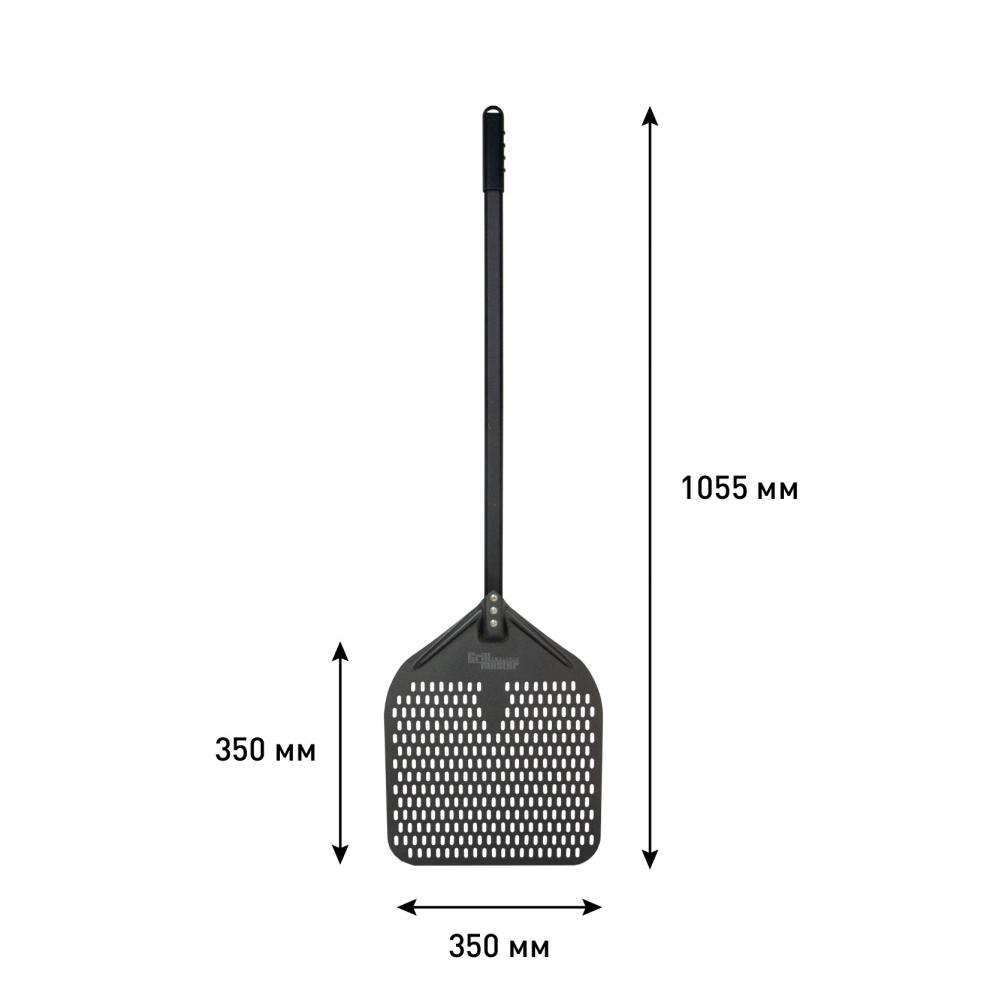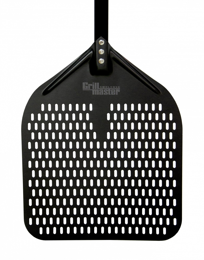 Лопата Grill Master 350-M используется для загрузки, выгрузки и поворачивания пиццы и других хлебобулочных изделий в процессе приготовления на предприятиях общественного питания, торговли, пищевых производствах и в домашних условиях. Модель оснащена перфорацией и удобной ручкой с резиновым наконечником. Кромка лопаты со снятой фаской. Материал изделия - анодированный алюминий черного цвета толщиной 1.5 мм.