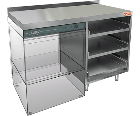 Открытый стол HICOLD НБМКБКП-12/5БЛ используется на предприятиях общественного питания, торговли, в гостиничном бизнесе и других сферах для комплектации барных стоек и размещения посудомоечной машины. Стол оснащен специальным крылом, под которое встраивается посудомоечная машина и 3 полками для корзин с бокалами. Материал корпуса - нержавеющая сталь AISI 430, столешница усилена листом ДСП.