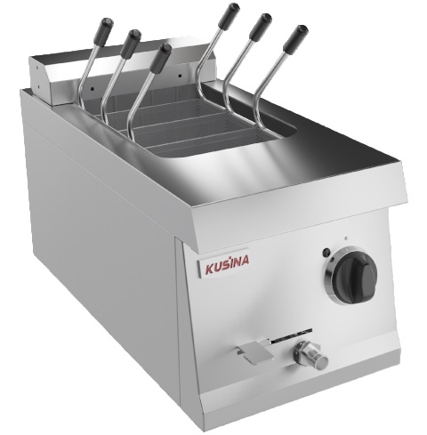 Макароноварка Kusina S6M100E используется на предприятиях общественного питания, торговли и на пищевых производствах для приготовления бульонов, третьих блюд, всех видов макаронных изделий, пельменей, вареников, а также овощей, корнеплодов, яиц и кипячения вод. Модель оборудована электромеханической панелью управления, индикатором нагрева, предохранительным термостатом, сливным краном и регулирующимися по высоте ножками. Материал - нержавеющая сталь.