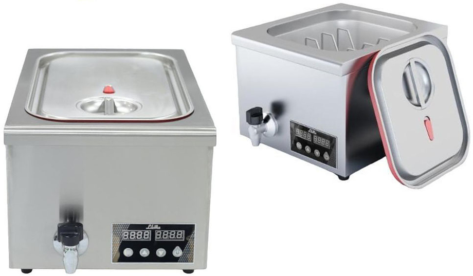 Аппарат Sous Vide LILOMA SOUS-VIDE SV 1/1 предназначен для приготовления широкого спектра блюд на предприятиях общественного питания, торговли и пищевых производствах. Модель оснащена электронным управлением, 2 цифровыми дисплеями, емкостью с крышкой,  регулировкой температуры, таймером, краном и опорами. Материал корпуса - высококачественная нержавеющая сталь SS201.