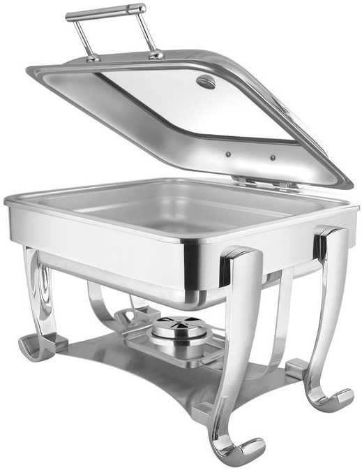 Чафинг-диш MACO Opulent OP/0/2/6.5/CP используется для постоянного подогрева первых и вторых блюд и поддержания их оптимальной температуры на предприятиях общественного питания, торговли, пищевых производствах и в сфере выездного обслуживания и для организации банкетов, фуршетов, шведских столов. Модель оборудована откидной крышкой со стеклом. Материал корпуса - высококачественная нержавеющая сталь, материал ножек - латунь с хромовым покрытием.