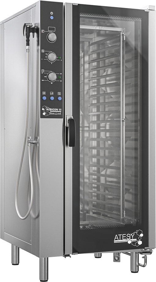 Пароконвектомат ATESY РУБИКОН АПК-20-1.1.-03-1 3-го поколения используется на предприятиях общественного питания и торговли для приготовления широкого спектра блюд на пару и с помощью сухого нагрева. В модели установлены кнопки и поворотные ручки. Материал дверц - двойное закаленное стекло с воздушным зазором.