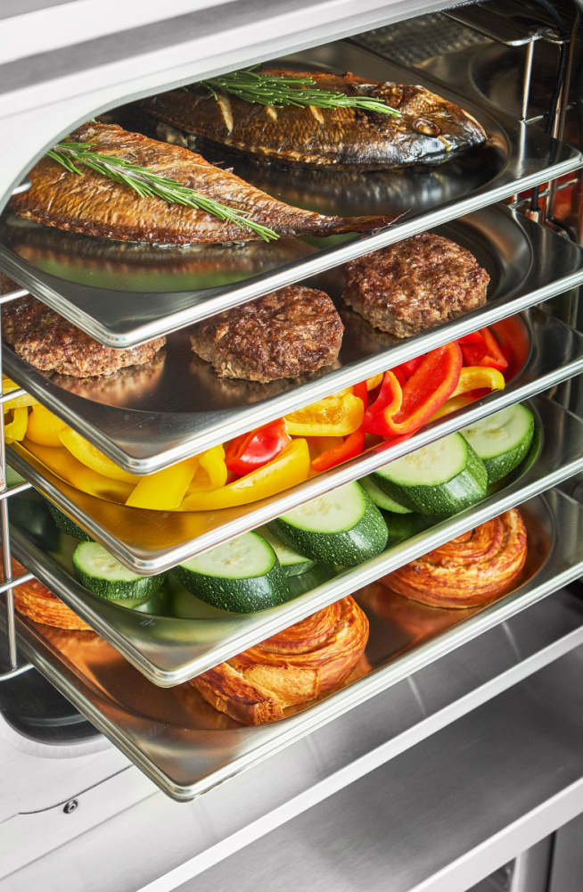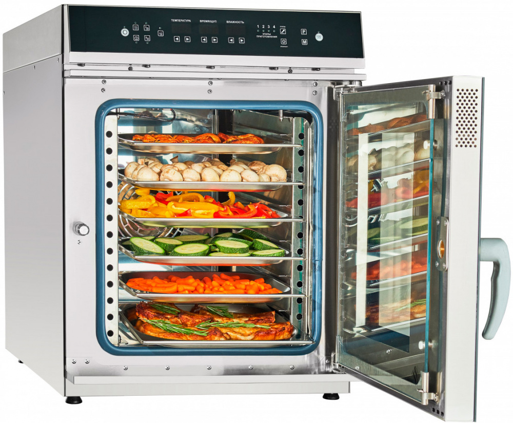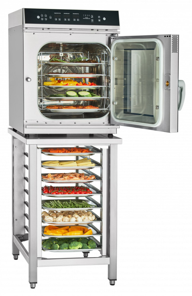 Благодаря небольшим габаритным размерам пароконвектомат подходит для помещений с ограниченным пространством и размещается на столе или подставке.