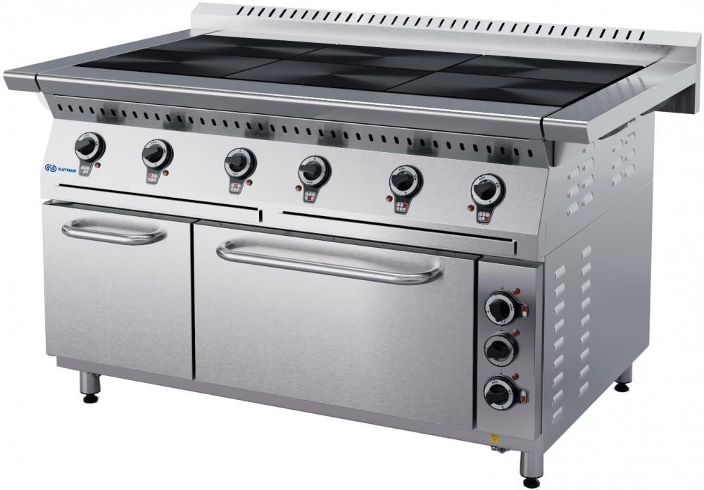 Электрическая плита KAYMAN ПЭ-6-13-МХ используется на предприятиях общественного питания, торговли и пищевых производствах для приготовления блюд в наплитной посуде. Плита оснащена комплектом боковых столешниц. Материал плиты - нержавеющая сталь, материал жарочного шкафа - углеродистая сталь.